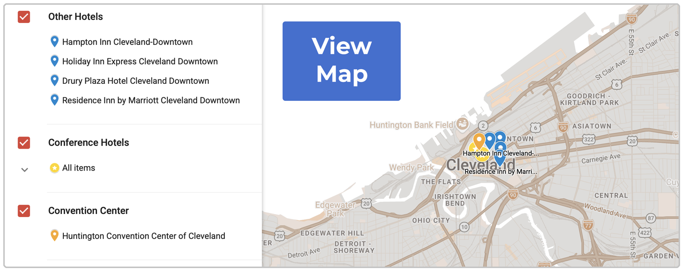 The Huntington Convention Center is located at the heart of downtown Cleveland at 300 Lakeside Ave, Cleveland, OH. The two conference hotels are located on the northern and southern side of the convention center.