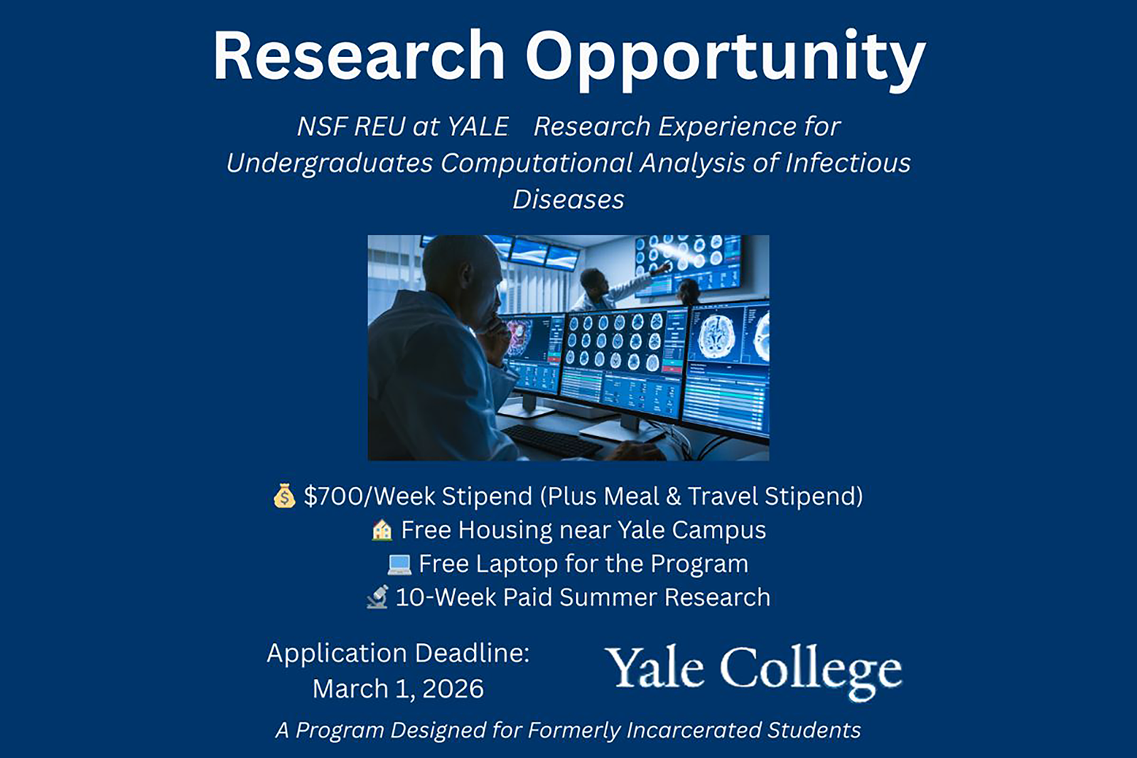 The NSF Research Experience for Undergraduates (REU) is offering a fully-funded 10-week program in Computational Analysis of Infectious Diseases, which is designed specifically for formerly incarcerated undergrads and community college students. This includes: $700/week + meal & travel stipends, free housing near Yale, a free laptop for your research, and faculty mentorship and graduate student guidance. Deadline: March 1, 2026.